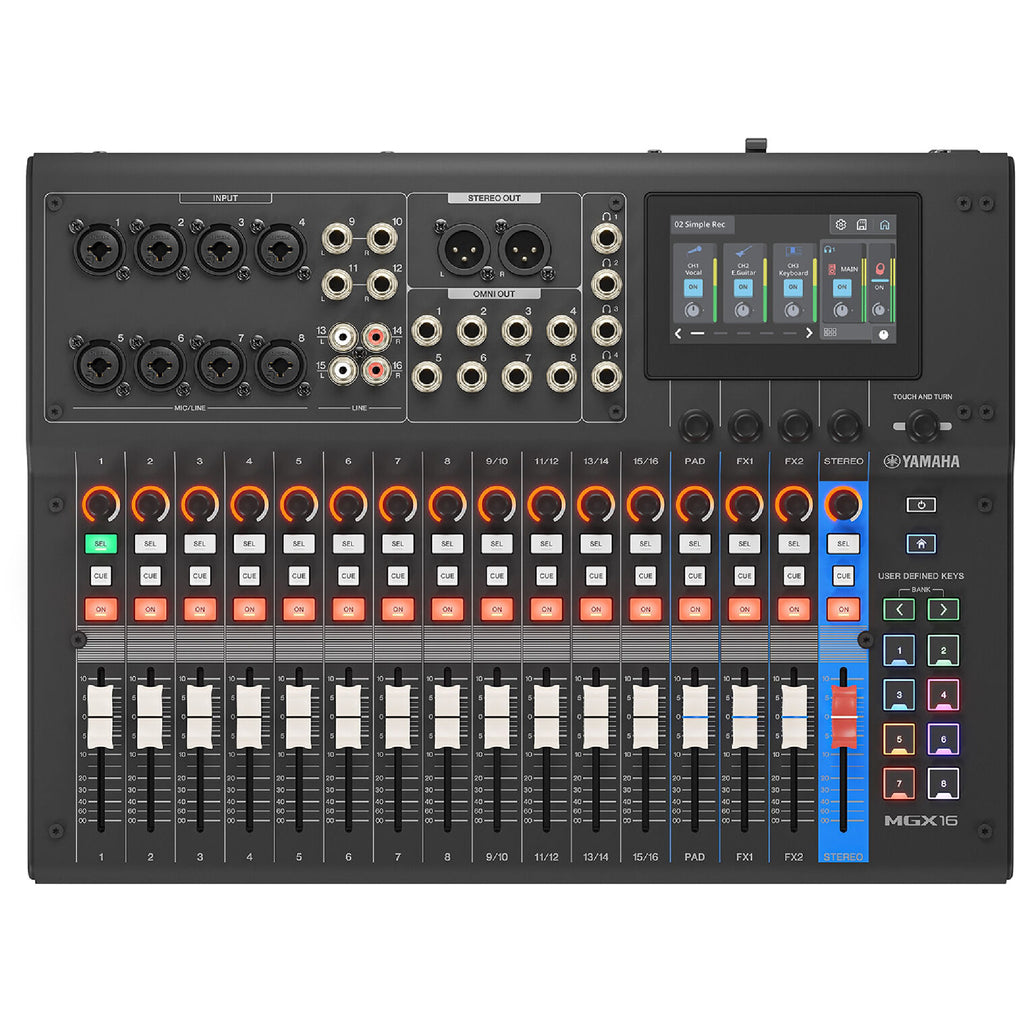 The MGX16 is designed for fast, intuitive operation. A responsive touchscreen GUI works alongside physical controls, including 16 smooth 60mm faders, send knobs, four customizable rotary encoders, and Yamaha’s Touch and Turn control. This hybrid approach preserves the tactile feel engineers expect while offering the precision and recall of a digital system.